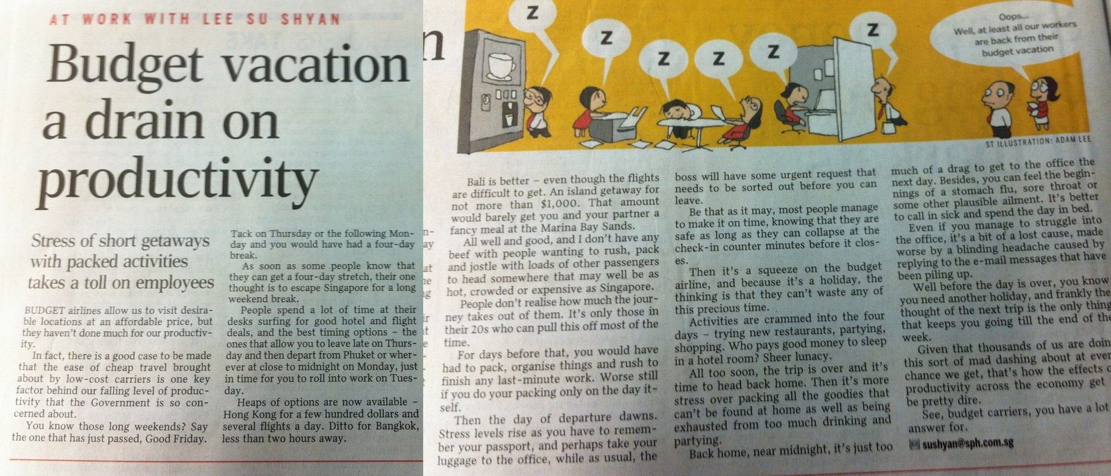 But this Monday was a different day. I was enjoying a takeaway of the epic KFC Double Down at the office table while I flipped through the papers. I found a a column titled: “Budget vacation a drain on productivity” and stopped eating.